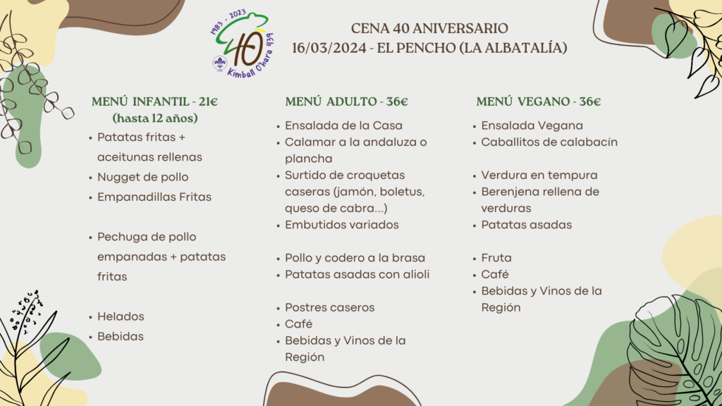 El Equipo Directivo del Grupo Scout Kimball O´Hara N.º 439 en nombre del Consejo y Comité de Grupo tiene el honor de invitarte a la Cena de Hermandad que celebraremos con motivo del 40 Aniversario de la fundación de nuestro Grupo Scout: